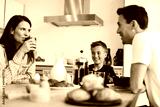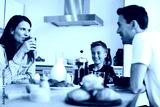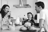 Smiling family eating breakfast together