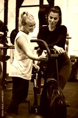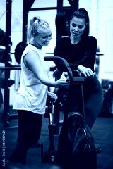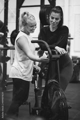 Two smiling women talking together over a gym exercise bike