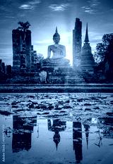 Big Buddha at sunset in Wat Mahathat temple, Sukhothai Historical Park, Thailand.