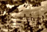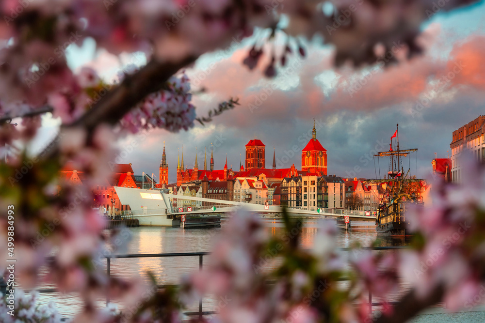 Blooming cherry trees by the Motława River at sunrise, Gdansk. Poland
