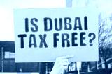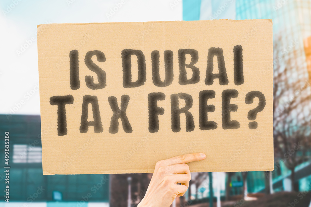 The question " Is dubai tax free? " is on a banner in men's hands with blurred background. Bargain. Data. Dubai. Finance. Freedom. Growth. Luxury. Money. Bank. Vat. Store. Sale. Buy