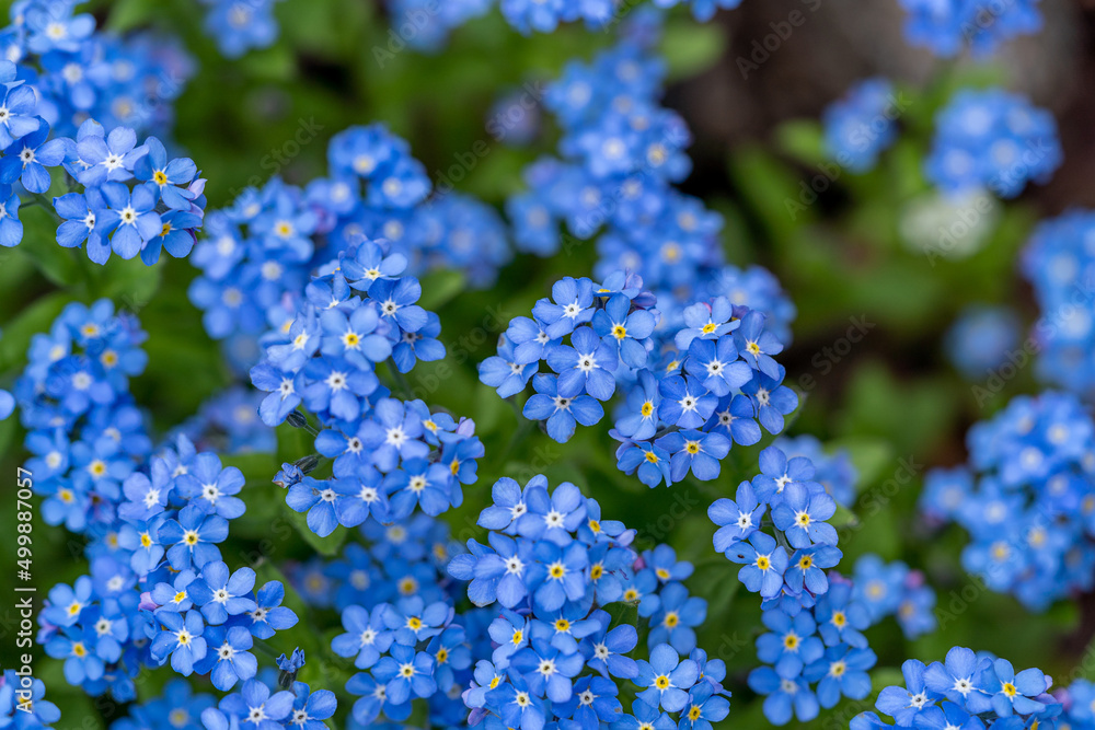 Forget me not flowers in the garden, blue flower bed, first spring flowers, blue nature background