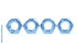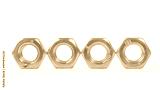 Four hexagonal nuts lined up in a row isolated on white with copy space