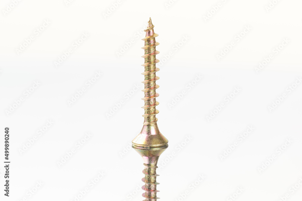 Gold colored screw standing on a mirror surface with reflection isolated with clipping path