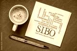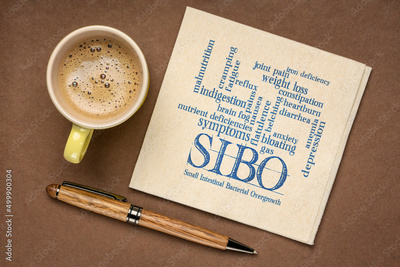 SIBO (small intestinal bacterial overgrowth) symptoms - word cloud on a napkin, flat lay with a cup of coffee, gut health concept