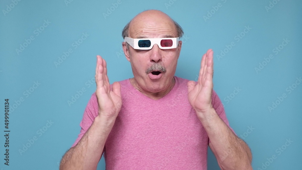 Senior caucasian man wearing 3D movie glasses watching interesting movie