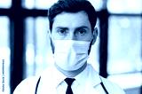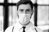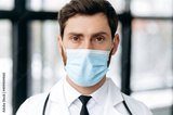 Close-up portrait of Caucasian proud male doctor, therapist, surgeon, cardiologist in a medical uniform, protective mask and with stethoscope, standing in a hospital, looking to the camera