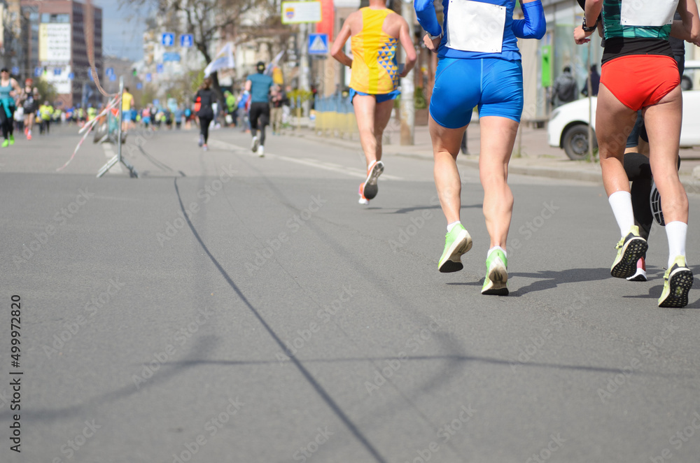 Marathon running race, many runners feet on road racing, sport competition, fitness and healthy lifestyle concept