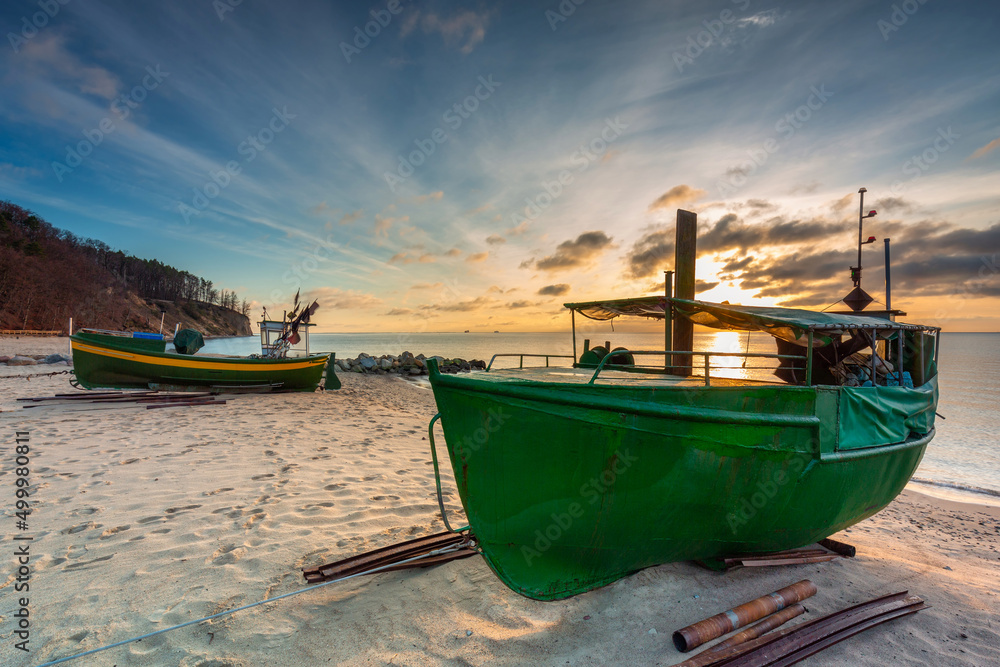 Beautiful landscape of the beach with fishing boats at sunrise in Gdynia Orlowo. Poland