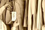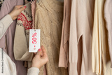 Woman customer looking on tag with 50% discount choosing sweater with christmas ornament in garment store. Winter shopping discount, sale