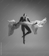 Black and white portrait of graceful muscled male ballet dancer dancing with fabric, cloth isolated on grey studio background. Grace, art, beauty concept. Weightless, flexible.