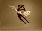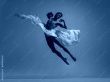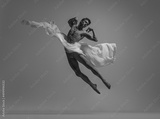 Black and white portrait of graceful muscled male ballet dancer dancing with fabric, cloth isolated on grey studio background. Grace, art, beauty concept. Weightless, flexible.