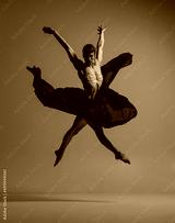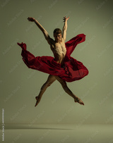 Flight. One young muscled man, flexible ballet dancer in action with red fabric, cloth isolated on olive color background. Theater, emotions, grace, art, beauty concept.