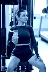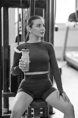A beautiful young sports caucasian woman in gray sportswear trains in the gym.