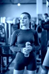 A beautiful young sports caucasian woman in gray sportswear trains in the gym.