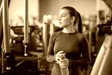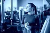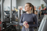 A beautiful young sports caucasian woman in gray sportswear trains in the gym.