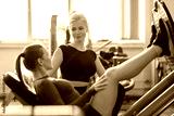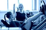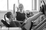 A young beautiful athletic woman trains in the gym with the help of a female coach. Leg press on the training apparatus.
