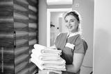 Portrait of smiling maid with fresh towels in hotel room.