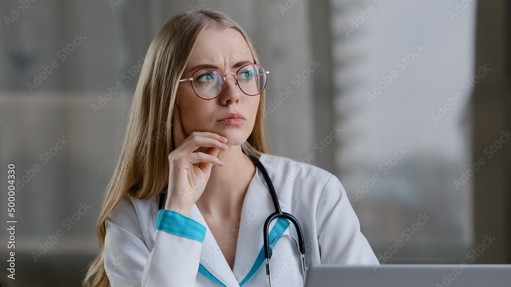 Focused caucasian female pensive nurse practitioner doctor therapist in white coat sitting at hospital clinic thinking of problem solution medical advice deep in thoughts healthcare application doubt
