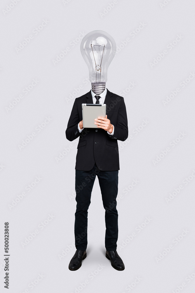 Modern poster of intelligent brilliant manager with lightbulb face marketing gadget isolated silver color background