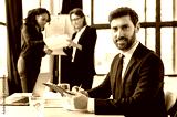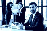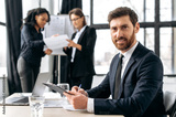 Portrait of handsome caucasian male business leader in formal suit at briefing meeting. Successful business man, company ceo, sits in the office during corporate brainstorm, looks at the camera, smile