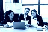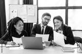 Business partners working together on a project. Multiracial colleagues are brainstorming on strategy together, sitting in modern office, studying documents, using laptop, discussing, smiling