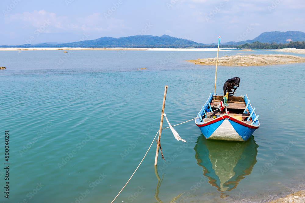 Fishing boat on tropical beach, summer outdoor day light, water transportation