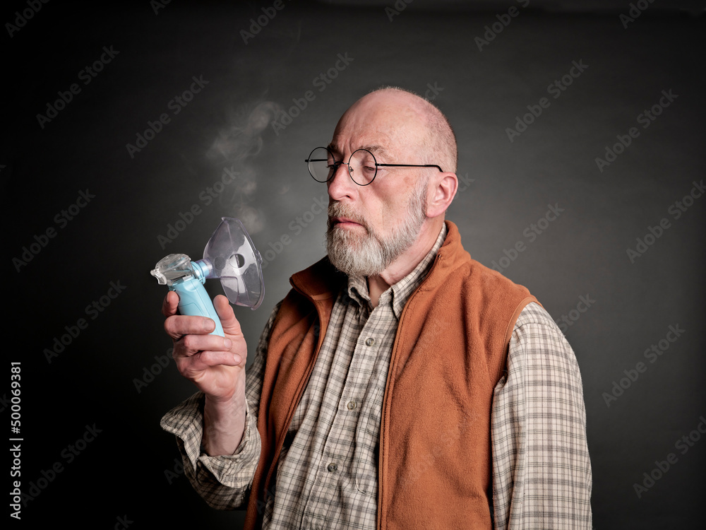 Head and shoulders portrait of a senior man using a portable handheld nebulizer, self care and respiratory therapy concept