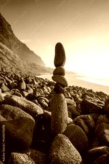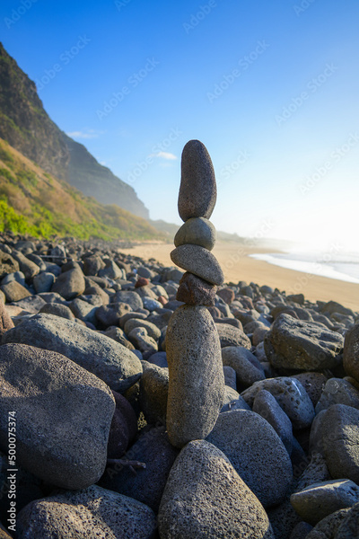 Stones stacked on the beach of the Polihale State Park at the western edge of the Na Pali coast on Kauai island in Hawaii, United States