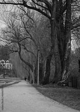 Wierzbowa aleja parkowa wzdłuż stawu , wczesną wiosną .