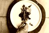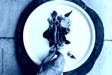 Chef's hand detail shot of crafting fine dining appetizer at restaurant