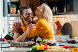 Young cheerful love couple preparing a healthy vegan lunch at home and have fun
