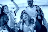 Cheerful friends of various nations watching a soccer championship together and supporting their national football team
