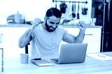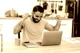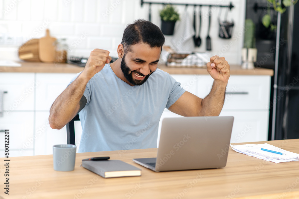 Successful joyful excited indian or arabian businessman, top manager, freelancer, sits in home office, shouts and rejoices at success, victory, good profit, looks at a laptop, gestures with his fists