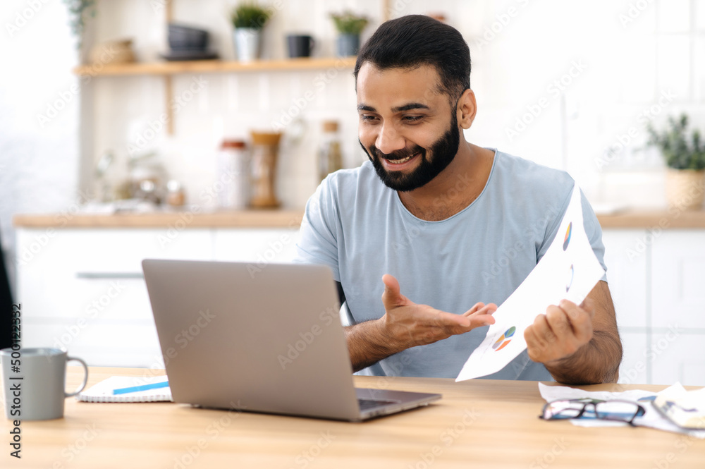Virtual online business meeting, distant conversation. Indian successful man, company coworker, works distantly, communicates with business partners by video call, shows a graph, discuss project