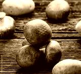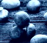 Fresh brown mushrooms, champignon and potato, ready for cooking, on wooden, dark background, selective focus