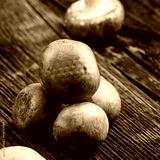 Brown mushrooms, champignon on wooden background, selective focus