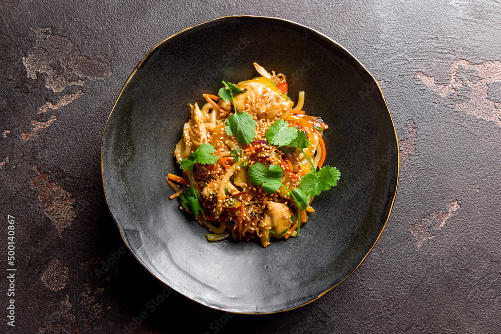 Udon noodles with chicken and vegetables on black bowl on dark stone table