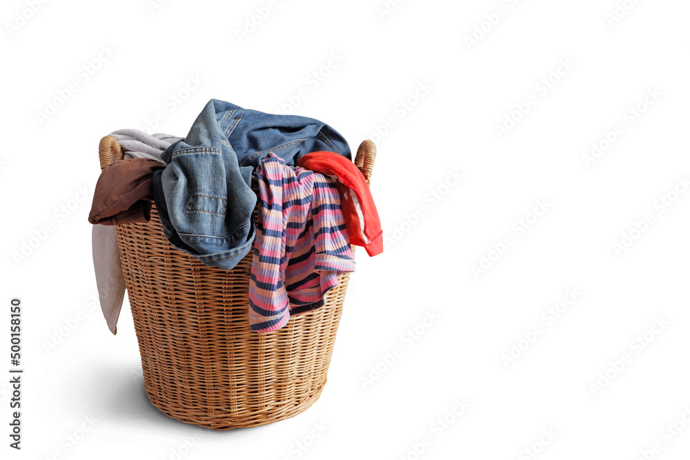Wooden wicker basket that holds lots of used clothes and prepares them for washing. isolated on white background.