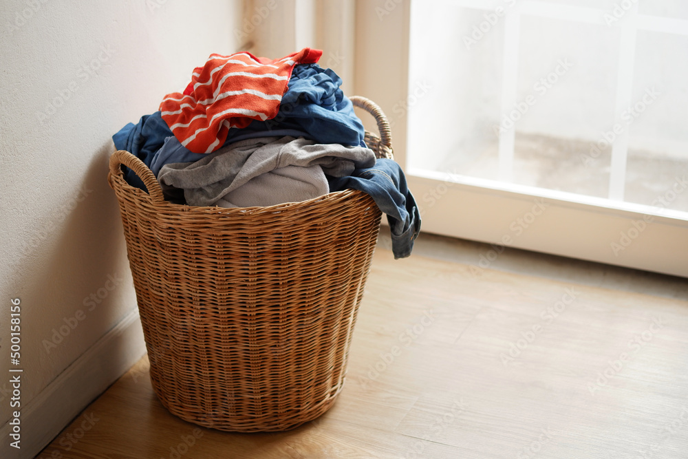 Wooden wicker basket that holds lots of used clothes and prepares them for washing.