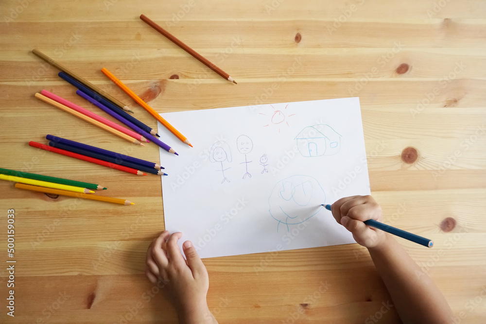 Cute Asian boy drawing happy family and home. with color pencils and white paper on wooden table, top view