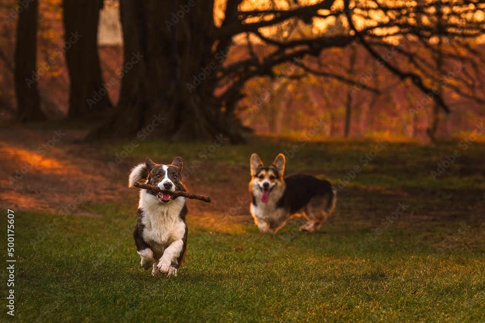 Dwa psy rasy corgi w czasie zabawy w parku w porannym słońcu