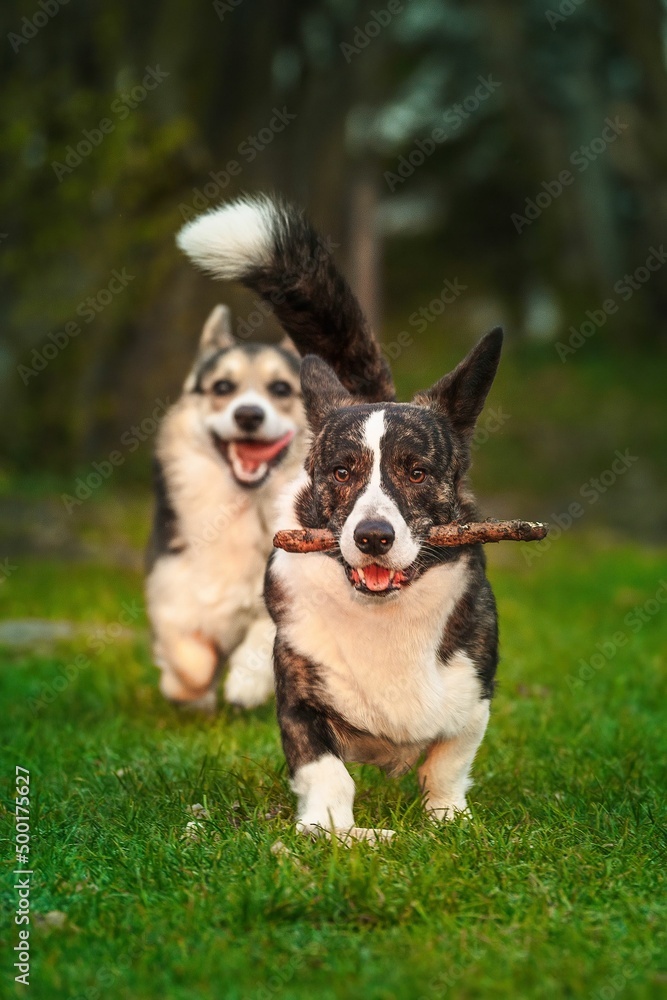 Dwa psy rasy corgi w czasie zabawy w parku w porannym słońcu