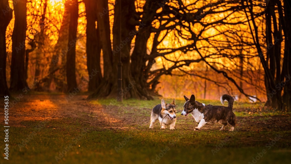 Dwa psy rasy corgi w czasie zabawy w parku w porannym słońcu