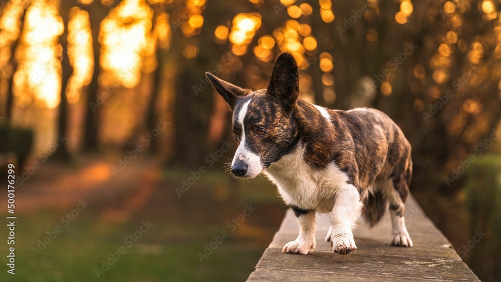 Pies rasy corgi cardigan w parku w porannym słońcu