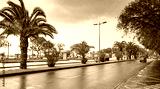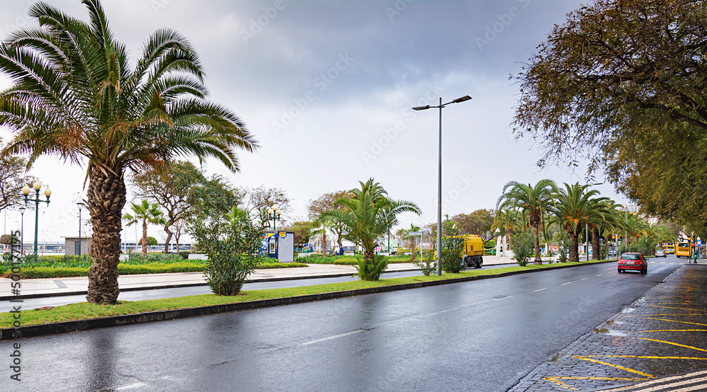 Urban landscape, embankment. Funchal city street with after rain. Madeira Island