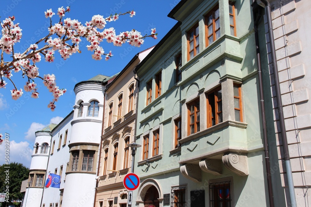 Bratislava street view in Slovakia. Spring time cherry blossoms.