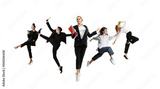 Set of emotional office workers jumping and dancing isolated on white background. Business, motion, immigration concept. Creative collage.