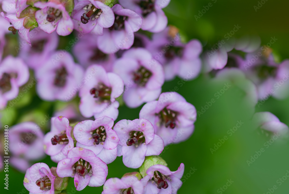 Pink bergenia flowers close-up. Selective focus.