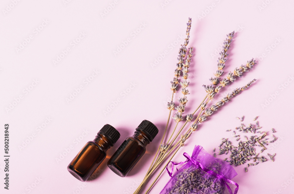 Branches of lavender and two glass bottles with cosmetic oil on a pink background..